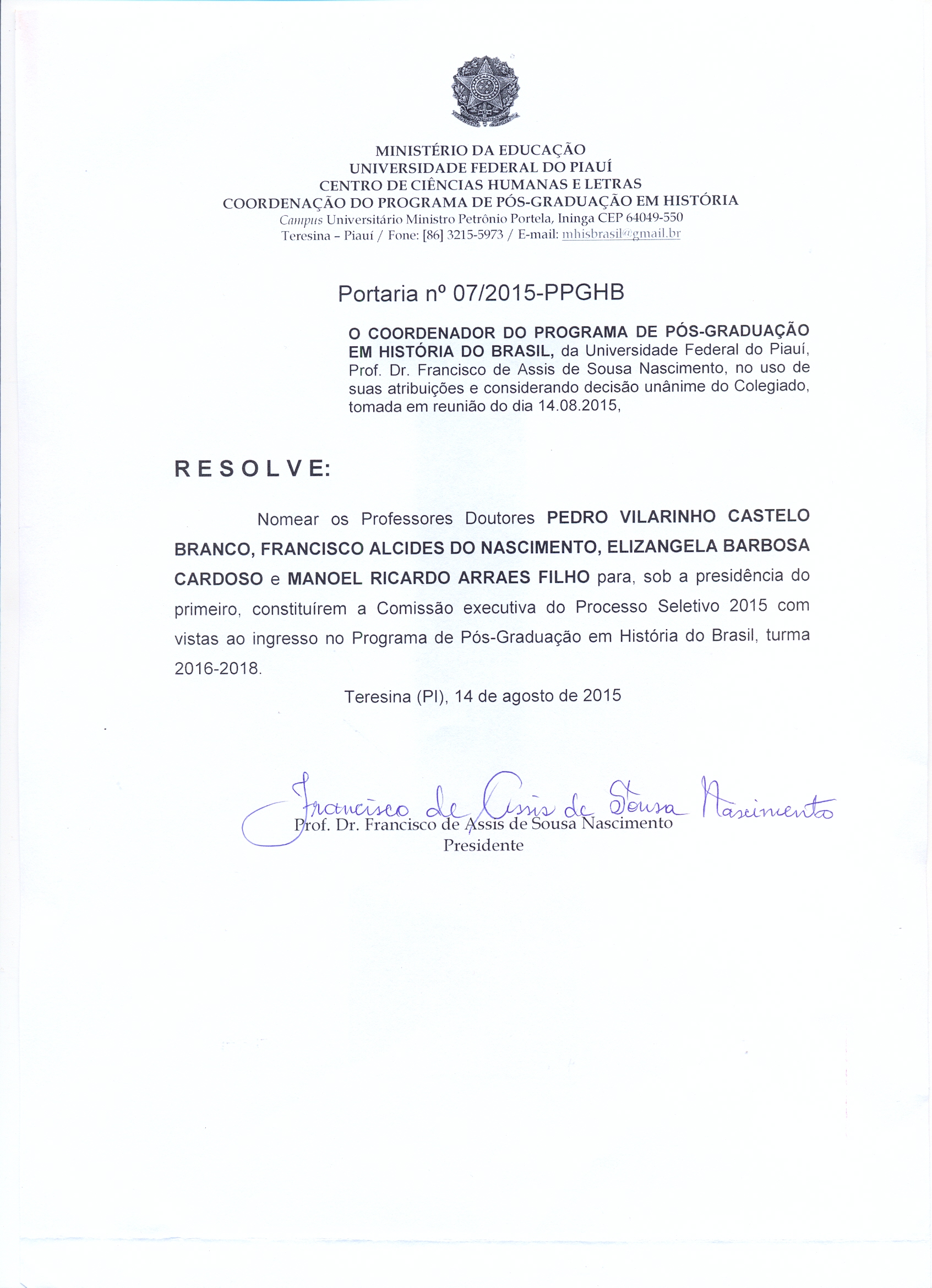 O PPGHB divulga a Portaria Nº 07/2015 Comissão executiva do Processo Seletivo 2015, turma 2016/2018.