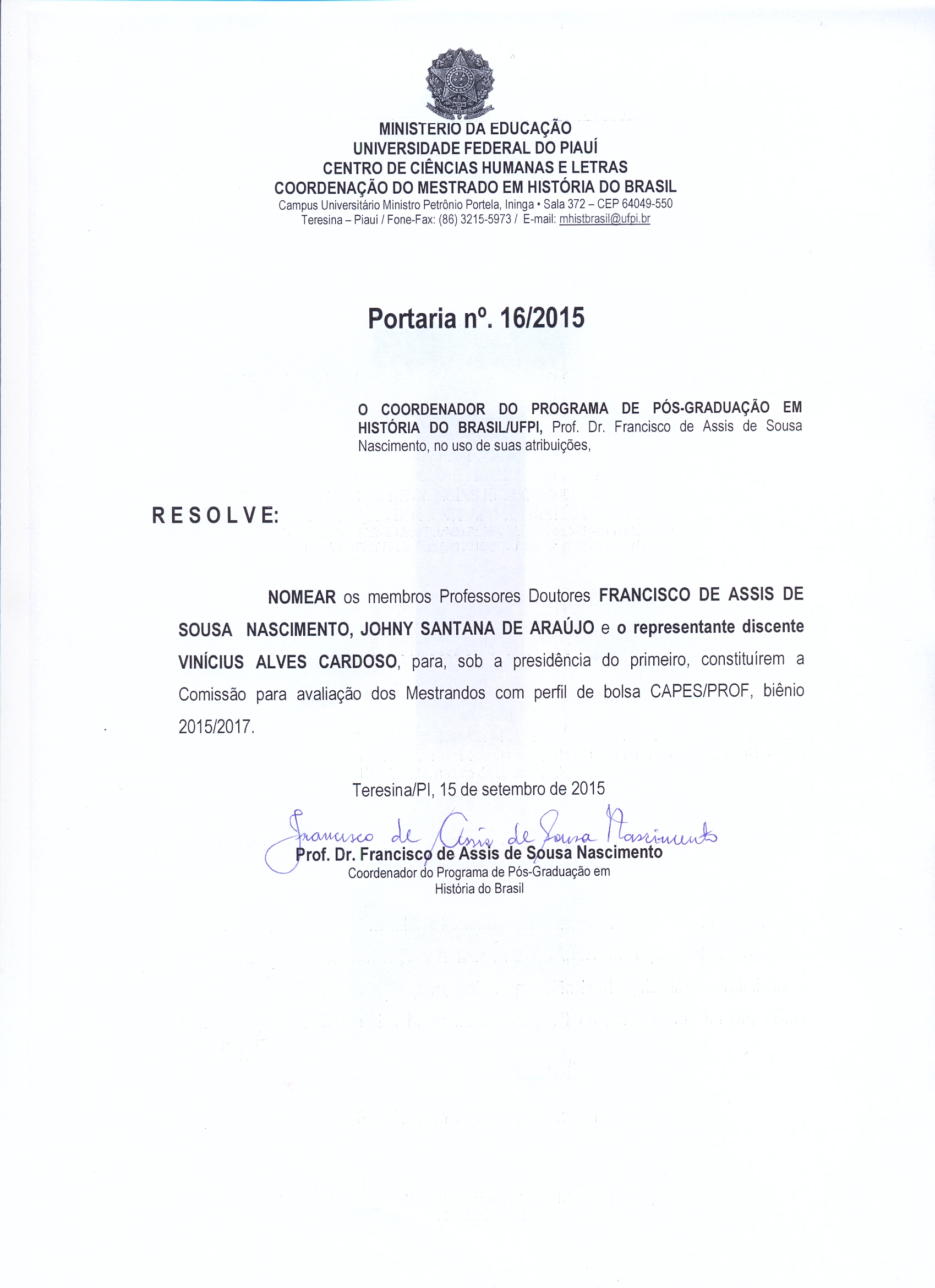 O PPGHB divulga a Portaria Nº 16 Comissão de Bolsa CAPES/PROF, biênio 2015/2017.