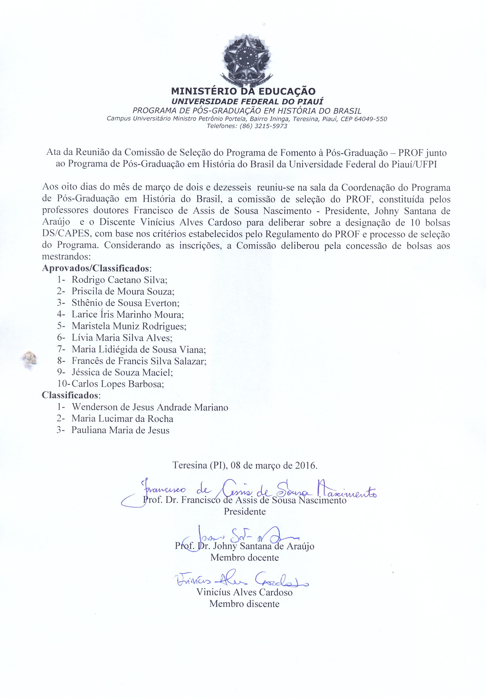 Resultado da Seleção do Programa de Fomento à Pós-Graduação -PROF junto ao PPGHB 08/03/2016 16:48