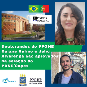 A doutoranda Daiane Rufino Leal e o doutorando Julio de Sá Alvarenga, que estão, respectivamente, no quarto e terceiro ano do curso de doutorado do Programa de Pós-graduação em História do Brasil foram aprovados na seleção nacional do Programa de Doutorado Sanduíche no Exterior da Fundação Coordenação de Aperfeiçoamento de Pessoal de Nível Superior – PDSE/ Capes. Daiane e Júlio irão fazer estágio de doutoramento na Universidade do Porto, em Portugal.