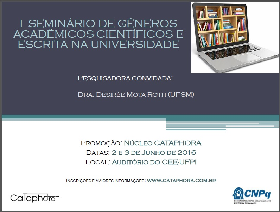 O Núcleo de Pesquisa Cataphora, com apoio do CNPQ, promove o 1º Seminário de Gêneros Acadêmico-científicos e Escrita na Universidade, com a presença de Desirée Mota Roth.