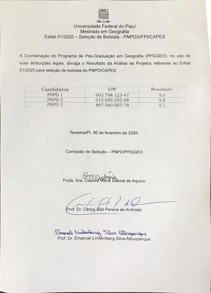 A Coordenação do Programa de Pós-Graduação em Geografia (PPGGEO), no uso de suas atribuições legais, divulga o Resultado da Análise dos Projetos referente ao Edital 01/2020 para a seleção de bolsista do PNPD.