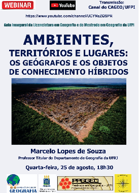 O Curso de Graduação em Geografia e o Programa de Pós-Graduação em Geografia convidam todas e todos da comunidade ufipiana e demais instituições de ensino e de pesquisa para participarem, no dia 25 de agosto, às 18:30h, da aula inaugural e de abertura do semestre intitulada “Ambientes, Territórios e Lugares: os geógrafos e os objetos de conhecimento híbridos” ministrada pelo Prof. Dr. Marcelo Lopes de Souza, da UFRJ.