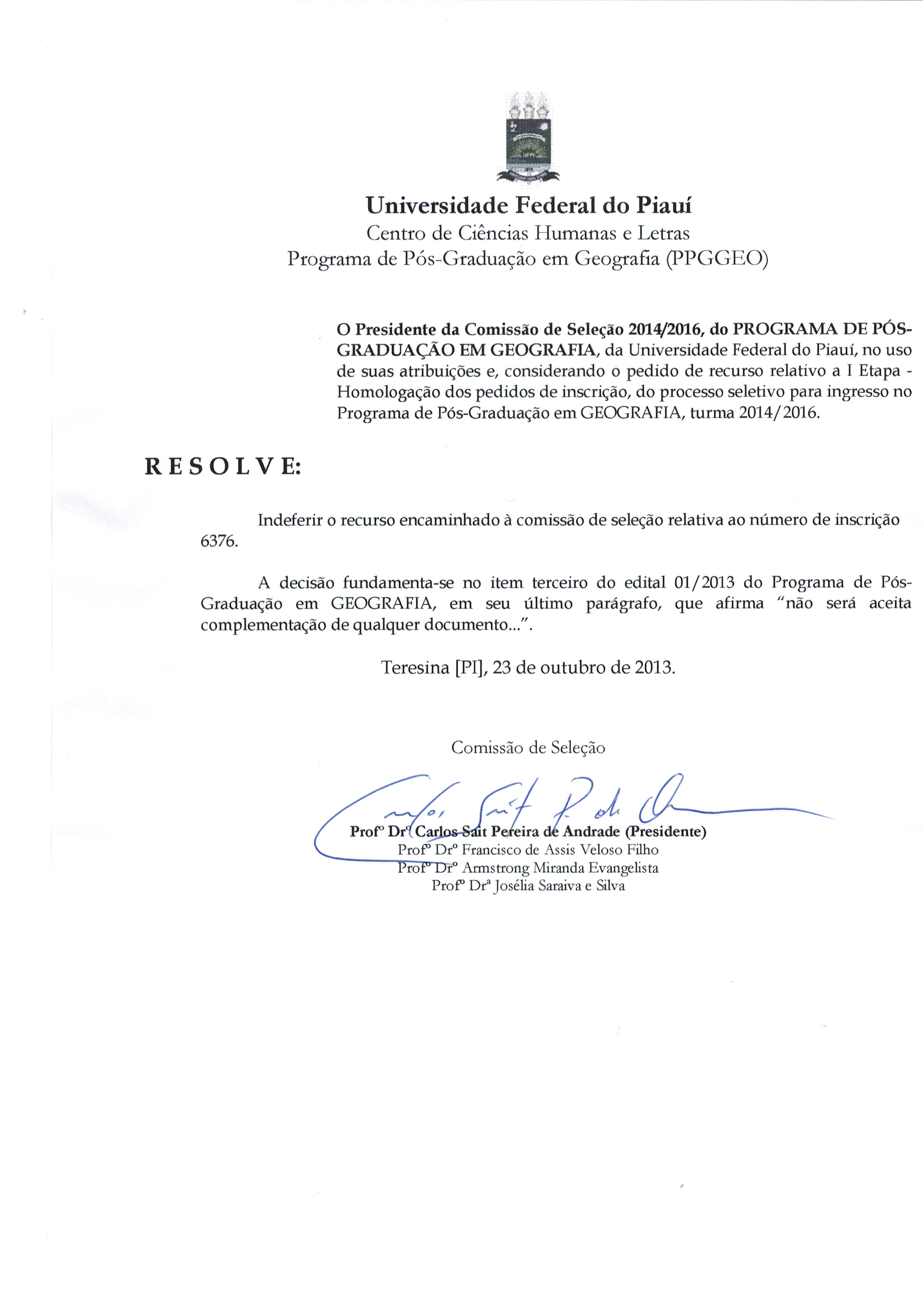 RESULTADO DE RECURSO DAS INCRIÇÕES INDEFERIDAS DO MESTRADO EM GEOGRAFIA / UFPI 23/10/2013 15:51