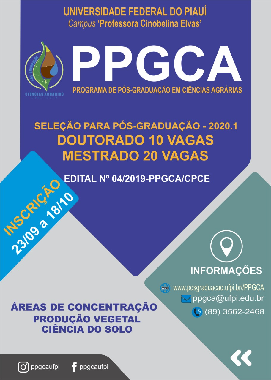 As inscrições ocorrerão no período de 23/09/2019 a 18/10/2019. O(a) candidato(a), para se inscrever, deverá acessar o site da UFPI, (www.ufpi.br), selecionar o menu sistemas SIG, se inscrever no sistema SIGAA (http://www.sigaa.ufpi.br/sigaa/public/home.jsf), e selecionando o Programa de Pós-Graduação em Ciências Agrárias, vinculado ao Campus Professora Cinobelina Elvas (CPCE). Após a inscrição junto ao sistema SIGAA, cada candidato(a) deverá entregar a documentação na Coordenação do Programa de Pós-Graduação em Ciências Agrárias (PPGCA), pessoalmente, por correspondência (via SEDEX) ou digital via e-mail (ppgca@ufpi.edu.br) até a data do último dia de inscrição (data da postagem). Caso a entrega dos documentos seja realizada por meio de postagem, deve-se enviar toda a documentação especificada no item 3.2, deste edital, para: Secretaria da Coordenação do Programa de Pós-Graduação em Ciências Agrárias (PPGCA), Campus Profa Cinobelina Elvas, Universidade Federal do Piauí – Avenida Manoel Gracindo, Km 01, Planalto Horizonte - CEP. 64.900-000, Bom Jesus, Piauí. Telefone: (89) 3562-2468. E-mail: ppgca@ufpi.edu.br. Caso opte por enviar a documentação de inscrição por e-mail, o candidato deverá scanear toda a documentação e enviar em arquivo único, no formato pdf. Os originais ou cópias autenticadas dos comprovantes das atividades deverão estar disponíveis para consulta caso necessário.