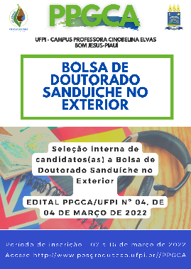 A Coordenação do Programa de Pós-Graduação em Ciências Agrárias (PPGCA), da Universidade Federal do Piauí (UFPI), torna público o processo seletivo para candidatos(as) a Bolsa de Doutorado Sanduíche no Exterior – SWE, no Programa de Pós-Graduação em Ciências Agrárias, nos termos do EDITAL N° 10/2022 – PDSE /CAPES.