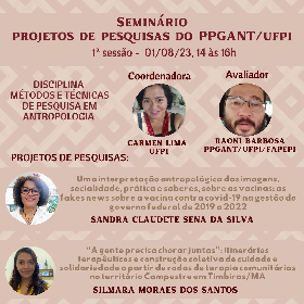 Encerrando as atividades da disciplina Métodos e Técnicas de Pesquisa em Antropologia (PPGAnt/UFPI), ministrada pela prof. Carmen Lima, será realizado o Seminário Projetos de Pesquisas do PPGANT/UFPI, nos dias 1, 2 e 9/08/2023.