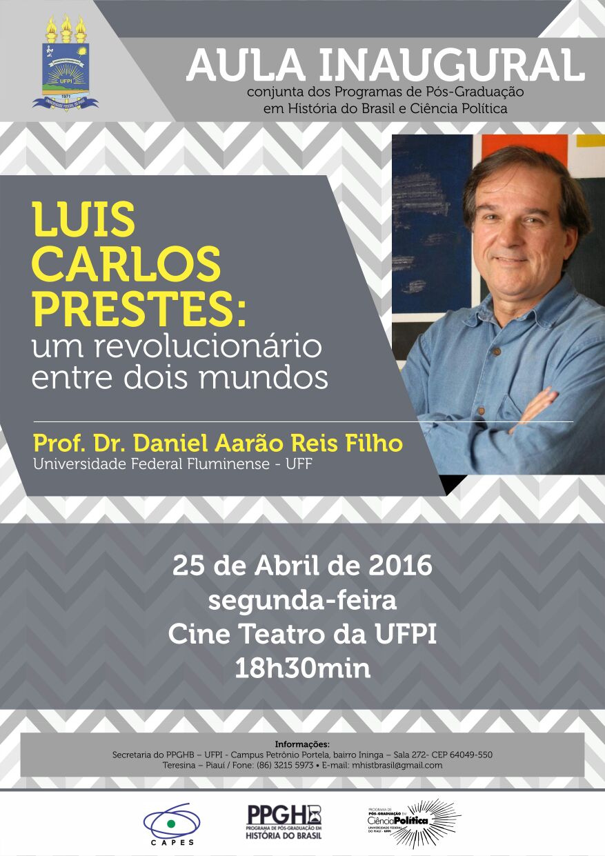 A Universidade Federal do Piauí (UFPI), com o Centro de Ciências Humanas e Letras (CCHL), por meio do Programa de Pós-Graduação em Ciência Política (PPGCP) e em História do Brasil (PPGHB) convida toda comunidade acadêmica para a Aula Inaugural dos PPGs de História do Brasil e de Ciência Política. A aula abordará como tema: “Luís Carlos Prestes: Um revolucionário entre dois mundos.” e contará com a presença do Prof. Dr. Daniel Aarão Reis Filho, da Universidade Federal Fluminense (UFF).