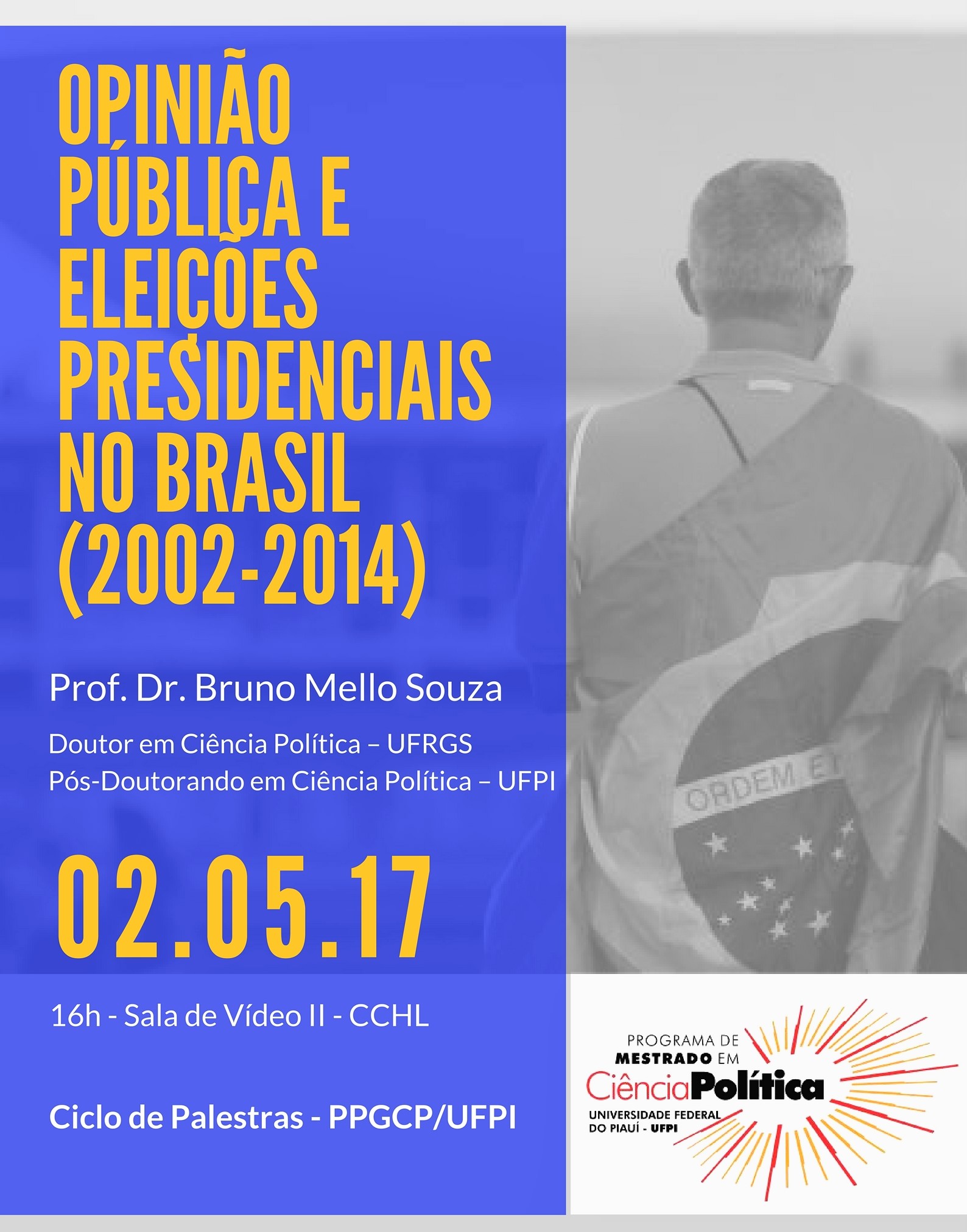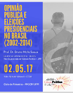 Com o intuito de compreender a dinâmica das eleições presidenciais brasileiras nos últimos anos, o Programa de Pós-graduação em Ciência Política, por meio do seu Ciclo de Palestras, promoverá na terça-feira, 02 de maio, às 16h, a palestra "Opinião Pública e Eleições Presidenciais no Brasil (2002-2014)". A discussão será conduzida pelo Prof. Dr. Bruno Mello Souza (Doutor em Ciência Política pela UFRGS e Pós-doutorando em Ciência Política pela UFPI) que, na oportunidade, apresentará os resultados preliminares da pesquisa realizada em seu estágio pós-doutoral junto ao Programa de Pós-Graduação em Ciência Política (PPGCP/UFPI) sob supervisão da Profa. Dra. Olívia Cristina Perez. A palestra será realizada na sala de vídeo II do Centro de Ciências Humanas e Letras (CCHL).