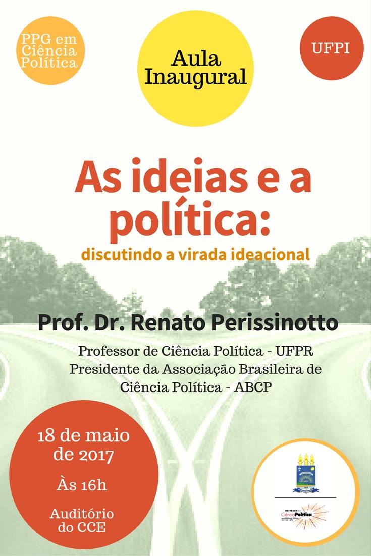 A Aula inaugural do Programa de Pós-graduação em Ciência Política da UFPI acontecerá dia 18 de maio, às 16h, no Auditório do CCE, com a conferência do prof. Dr. Renato Perissinotto, presidente da Associação Brasileira de Ciência Política (ABCP) e professor de Ciência Política da UFPR. O tema da conferência será "As ideias e a política". A palestra vira abordar a recente "virada ideacional" na Ciência Política, discutindo suas implicações teóricas e seus procedimentos metodológicos.