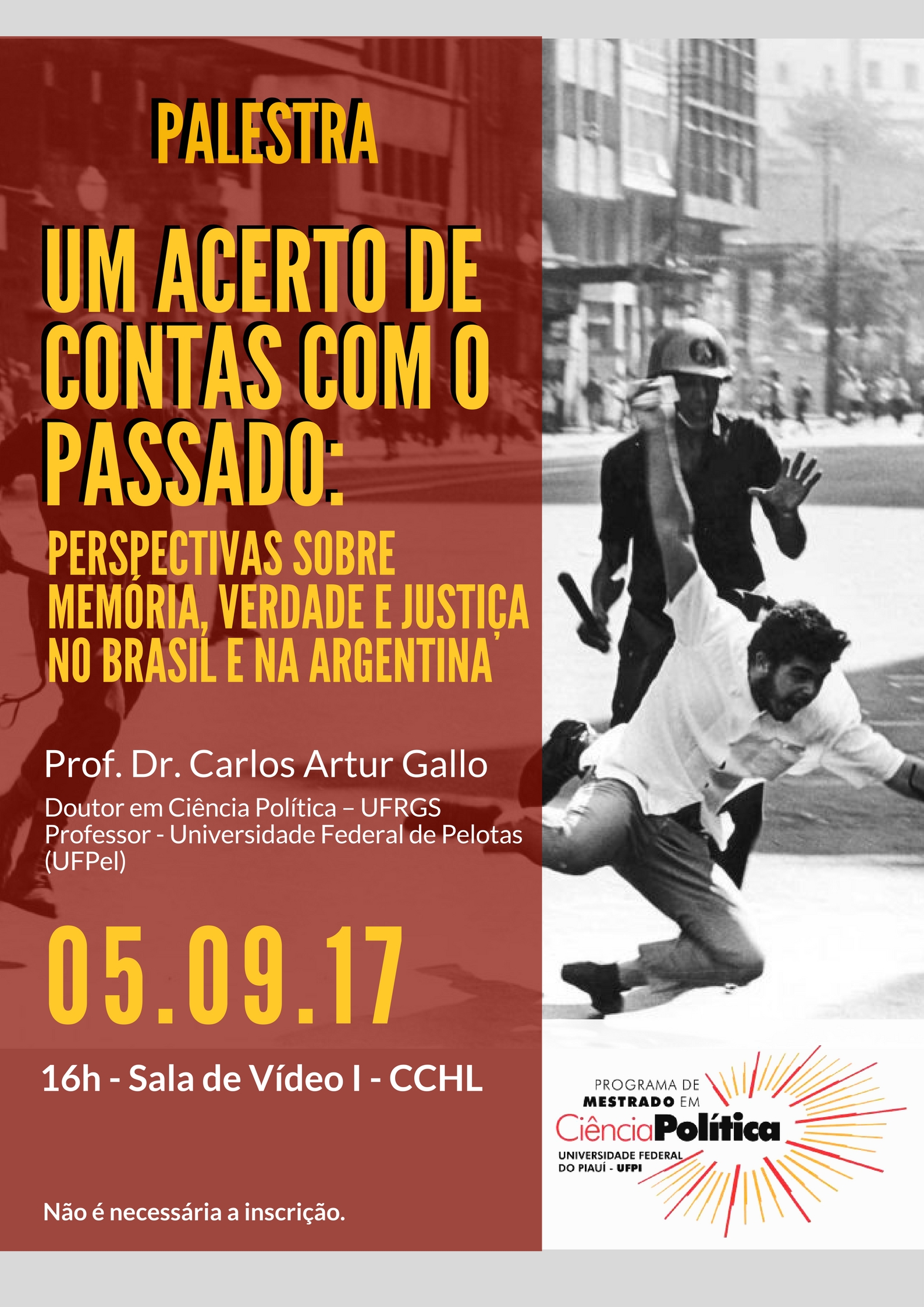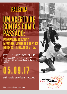 Convidamos-os(as) a acompanhar a palestra a ser ministrada pela prof. Dr. Carlos Artur Gallo (Doutor em Ciência Política – UFRGS e professor da Universidade Federal de Pelotas), intitulado "Um acerto de contas com o passado: perspectivas sobre memória, verdade e justiça no Brasil e na Argetina".