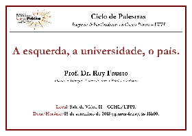 Convidamos-os(as) a participar da palestra ministrada pelo Prof. Dr. Ruy Fausto (Doutor em Filosofia - Université Paris 1 / Pantheon Sorbonne), intitulada "A esquerda, a universidade, o país".