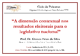 Convidamos-os(as) a participar da palestra ministrada pelo Prof. Dr. Glauco Peres da Silva (Doutor em Administração Pública e Governo - Universidade de São Paulo), intitulada "A dimensão contextual nos resultados eleitorais para o legislativo nacional".
