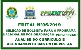 A Universidade Federal do Piauí (UFPI), por meio da Pró-Reitoria de Ensino de Pós-Graduação (PRPG), do Centro de Ciências da Saúde (CCS) e da Coordenação do Programa de Pós-Graduação em Enfermagem (PPGEnf), torna público o resultado da análise de currículo e agendamento das entrevistas - EDITAL Nº 05/2019 - PPGENF/CCS/UFPI -  Seleção de Bolsista para o Programa Nacional de Pós-Graduação-PNPD do Programa de Pós-Graduação em Enfermagem - PPGENF - (PNPD 2019/CAPES).
