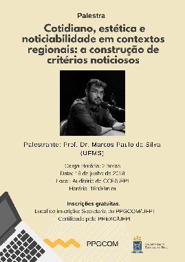 A Universidade Federal do Piauí, por meio do Programa de Pós-Graduação em Comunicação (PPGCOM), convida toda a comunidade para a palestra “Cotidiano, estética e noticiabilidade em contextos regionais: a construção cultural de critérios noticiosos” que será proferida pelo Prof. Dr. Marcos Paulo da Silva da Universidade Federal do Mato Grosso do Sul (UFMS).
