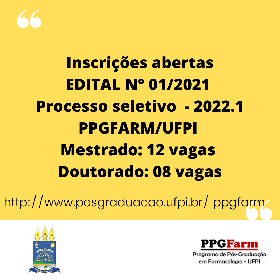 A Universidade Federal do Piauí, por meio da Pró-Reitoria de Ensino de Pós-Graduação e do Programa de Pós-graduação em Farmacologia/CCS, no uso de suas atribuições, considerando o EDITAL Nº 01, de 08 de setembro de 2021, torna público o ADITIVO II que trata do adiamento da data final do período de inscrição.