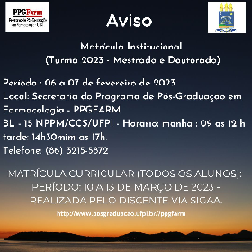 O Programa de Pós-Graduação em Farmacologia - PPGFARM/CCS/UFPI, informa sobre o periodo de matriculas: