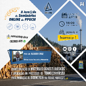 Abertas para o público em geral as inscrições para a 4a. Palestra da II Jornada de Seminários Online do PPGCM, a ser ministrada pelo Prof. Dr. Glauber Cruz (UFMA), cujo título é "Caracterização de materiais lignocelulósicos e aplicação em processos de termoconversão para produção de bioenergia na região Nordeste", a ser realizada na próxima quarta-feira, às 18 horas, via Live do Youtube, dia 27/10/2021.