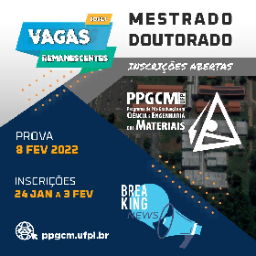 A Universidade Federal do Piauí (UFPI), através da Pró-Reitoria de Ensino de Pós-Graduação, do Centro de Tecnologia (CT) e da Coordenação do Programa de Pós-Graduação em Ciência e Engenharia dos Materiais (PPGCM), comunica a abertura das inscrições e realização de seleção para preenchimento de vagas remanescentes: 12 (doze) vagas para o curso de Mestrado e 07 (sete) vagas para o curso de Doutorado. As inscrições serão realizadas no Sistema Integrado de Gestão de Atividades Acadêmicas - SIGAA, acesso no sítio: www.sigaa.ufpi.br, no período de 24 de Janeiro a 03 de Fevereiro de 2022. Posteriormente, o candidato deverá preencher o formulário de inscrição online (https://forms.gle/JRA4mCrahogtwwyR7) para enviar a documentação para Coordenação do Programa de Pós-Graduação em Ciência e Engenharia dos Materiais de 24 de Janeiro a 03 de Fevereiro de 2022, via internet.