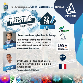 Abertas as INSCRIÇÕES até 21 de Novembro para Palestras Interação: Brasil-França a ser realizada pelo PPG em Ciência e Engenharia dos Materiais e receba o certificado de participação.  As Palestras serão realizadas no Auditório de Física no dia 22/11/2024 no horário de 09:00 – 12:00h ministradas pelos Pesquisadores do CERMAV/França: ISSEI OTSUKA (tema: Electrospinning of Functional Polysaccharides Toward Smart Nanofibrous Materials) e SAMI HALILA (tema: Synthesis & Applications of Carbohydrate-Based Amphiphiles)INSCRIÇÕES DE 15/11 À 21/11/2024.  Aceso o link para fazer sua Inscrição: Clique aqui.