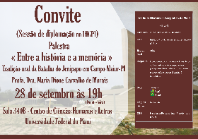 Coordenadora do Programa de Pós-Graduação em Sociologia da Universidade Federal do Piauí, Maria Dione Carvalho de Morais, convida toda a comunidade acadêmica, para palestra em sessão de posse no Instituto Histórico e Geográfico do Piauí (IHGPI) a realiza-se-á no dia 29 de setembro de 2017, às 19h, na sala 340B localizada no Centro de Ciências Humanas e Letras (CCHL/UFPI) sobre o tema: "Entre a história e a memória": tradição oral da Batalha do Jenipapo em Campo Maior-PI.