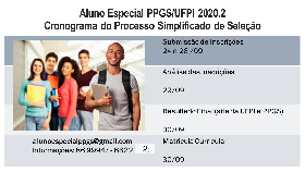 O Programa de Pós-graduação em Sociologia - PPGS da Universidade Federal do Piauí - UFPI torna publico o Processo Seletivo para o/as interessado/as em ingressar no periodo 2020.2 como aluno/as em caráter especial do Mestrado, podendo matricularem-se em até duas (02) disciplinas.