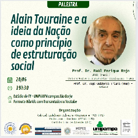 Nesta terça-feira, dia 20/6, às 19h30, acontece a palestra Alain Touraine e a ideia da Nação como princípio de estruturação social, com o Prof. Dr. Raúl Enrique Rojo (UFRGS, Brasil/Centre d'Analyse et d'Intervention Sociologiques, França). O evento terá formato híbrido, ocorrendo presencialmente no Estúdio de TV da Unipampa São Borja-RS, com transmissão no YouTube.
