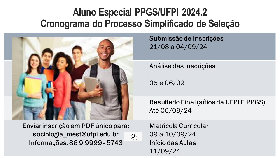 O Programa de Pós-graduação em Sociologia - PPGS da Universidade Federal do Piauí - UFPI torna publico o Processo Seletivo Simplificado para o/as interessado/as em ingressar no periodo 2024.2 como aluno/as em caráter especial do Mestrado, podendo matricular-se em até duas (02) disciplinas.