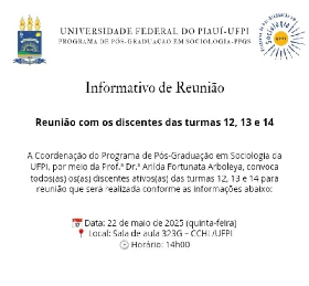 A Coordenação do Programa de Pós-Graduação em Sociologia da Universidade Federal do Piauí (PPGS-UFPI) tem a satisfação de convidá-los para a I Reunião da Coordenação com os Discentes, cujo tema será: "Alinhando Objetivos e Metas do PPGS-UFPI".