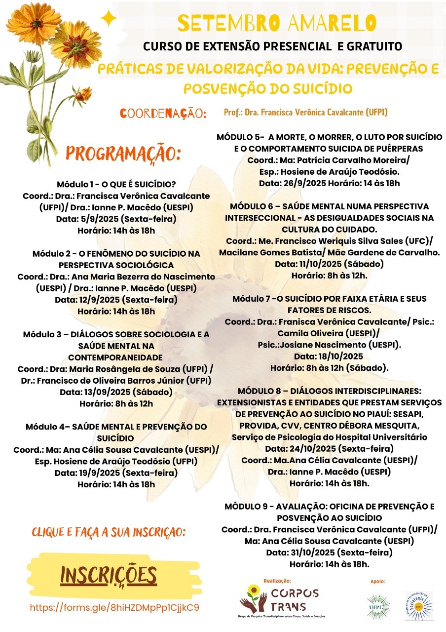 Em alusão à campanha Setembro Amarelo, o Grupo de Pesquisa Transdisciplinar sobre Corpo, Saúde e Emoções (Corpo Trans) da Universidade Federal do Piauí (UFPI) realiza o curso de extensão Práticas de Valorização da Vida: Prevenção e Posvenção do Suicídio, coordenado pela professora Francisca Verônica Cavalcante. As inscrições estão abertas e devem ser feitas por meio de formulário eletrônico.