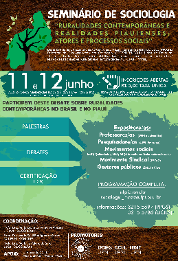 O Programa de Pós-Graduação em Sociologia em parceria com o DCIES - Departamento de Ciências Sociais da Universidade Federal do Piauí (UFPI/CCHL) informa que nos dias 11 e 12 de junho acontecerá no auditório Noé Mendes, o Seminário de Sociologia "Ruralidades Contemporâneas e Realidades Piauienses: atores e processos sociais".
