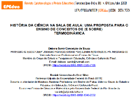 Venho parabenizar os autores Debora Samir Conceição de Souza e Boniek Venceslau da Cruz Silva, do artigo "HISTÓRIA DA CIÊNCIA NA SALA DE AULA: UMA PROPOSTA PARA O ENSINO DE CONCEITOS DE (E SOBRE) TERMODINÂMICA", publicado na revista Revista Epistemologia e Práxis Educativa.