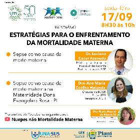 Acontece nesta sexta-feira (17), das 8:30 as 10 horas, no canal do Nuepes no YouTube, o webnário “Estratégias para o Enfrentamento da Mortalidade Materna”. O evento é organizado pelo Núcleo de Estudos, Pesquisa e Extensão em Educação Permanente para o SUS (NUEPES) da UFPI em parceria com a Universidade Aberta do SUS (Una-SUS/UFPI) e a Secretaria de Estado da Saúde (SESAPI).
