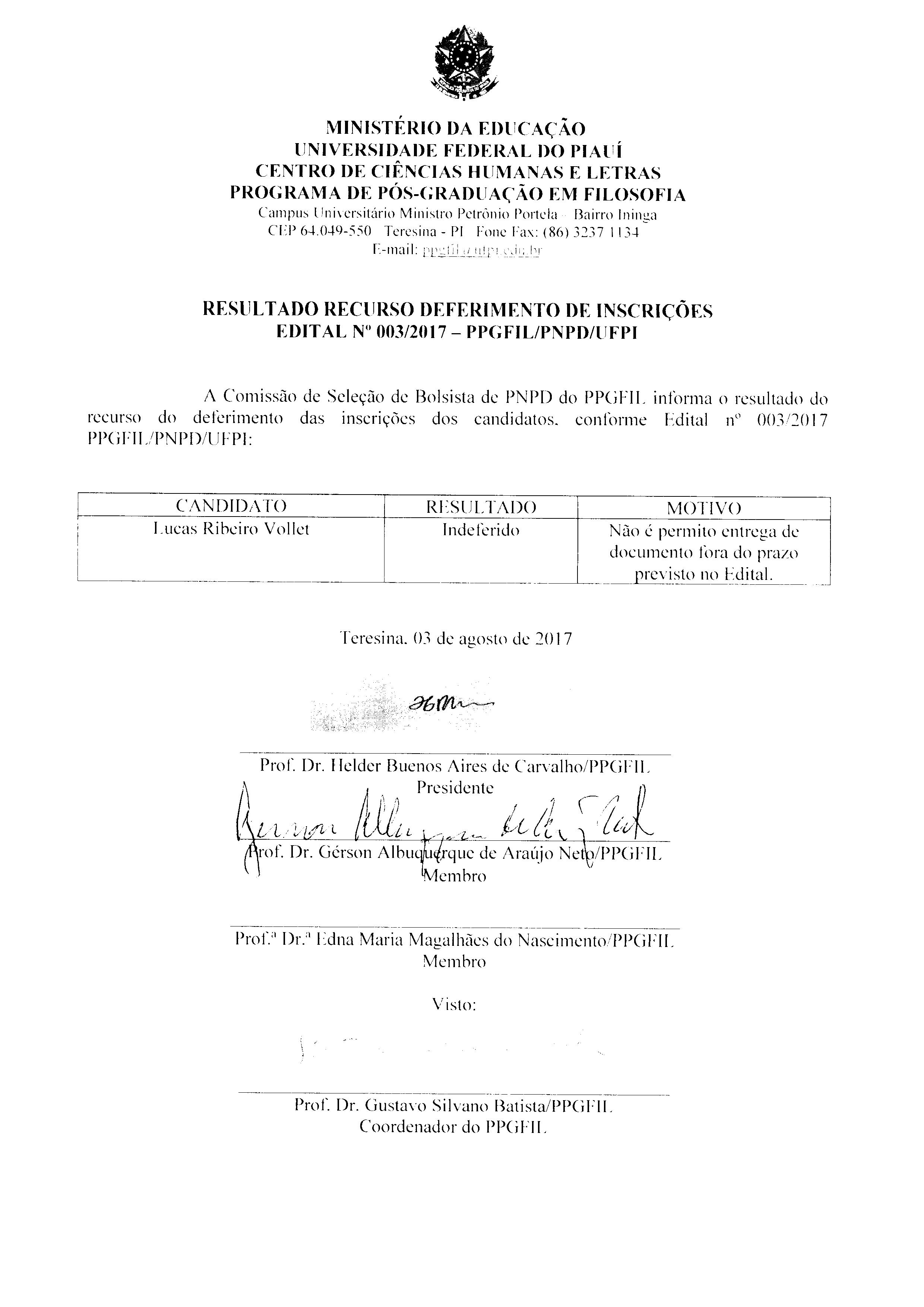 A COMISSÃO DE SELEÇÃO DO PNPD 2017 DO PPGFIL TORNAM PÚBLICO O RESULTADO DO RECURSO DO DEFERIMENTO DAS INSCRIÇÕES DOS CANDIDATOS PARA BOLSISTAS PNPD/CAPES/UFPI/PPGFIL. CONFIRA NO ANEXO
