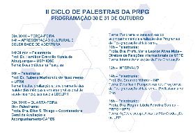 O Ciclo de Palestra é muito importante para as nossas Pós-Graduações-UFPI assim, reforço o chamamento para que todos participem. O Ciclo de Palestra iniciará amanhã 30/10 a partir das 14h no Auditório do CT e conto com a presença de todos.